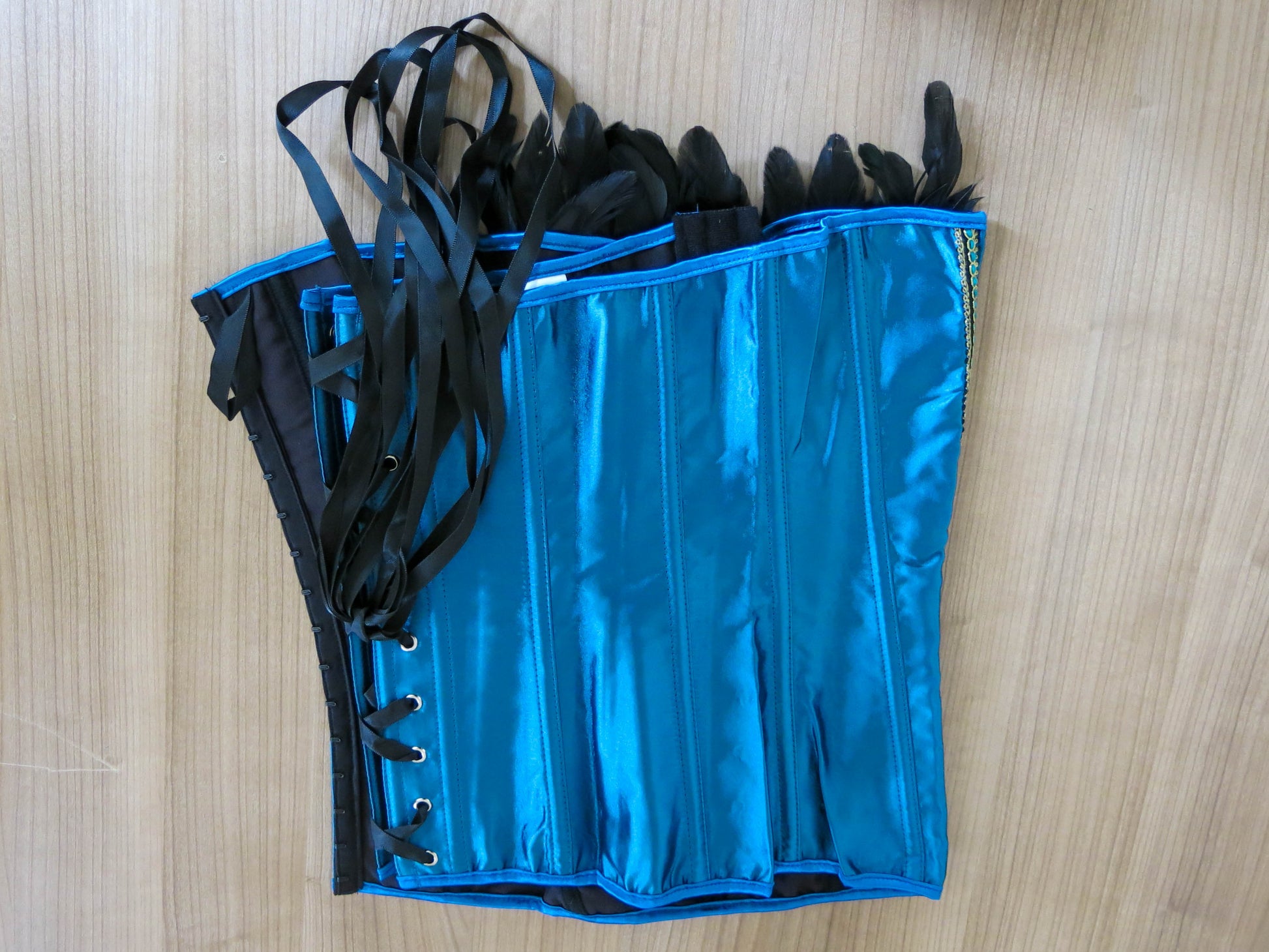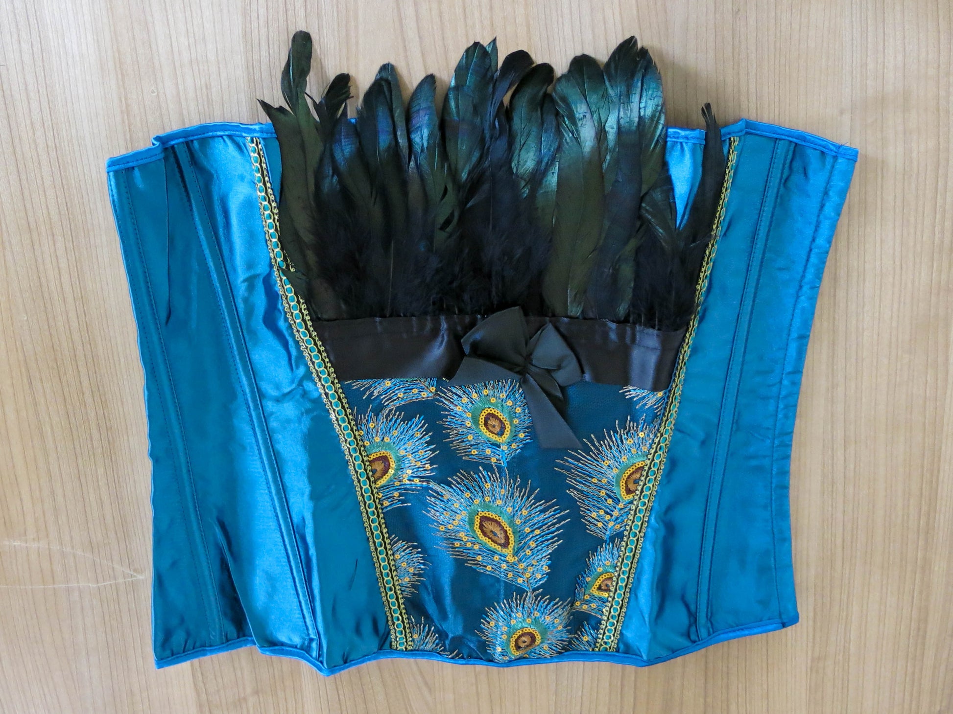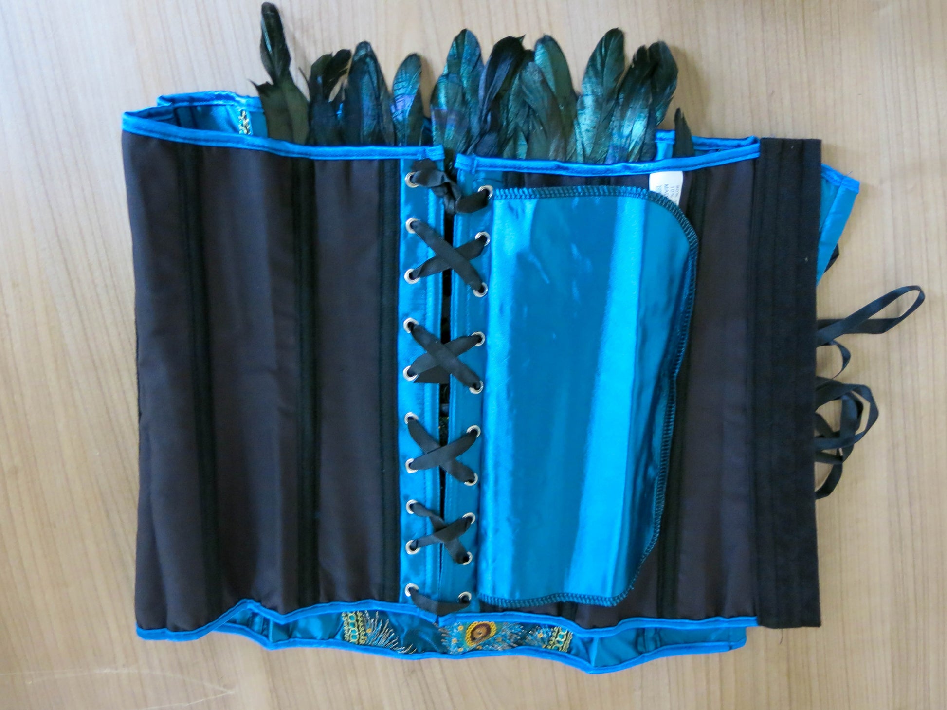 Schönes Korsett zum schnüren mit Pfauenmuster und schwarzen Federn.